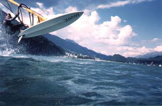 Each year about 500 long distance freaks come to attend the "Engadin Surf Marathon" which was first held in 1978. The premiere was won by a 15 years old boy from Hawaii. Robby Naish started his victorious career on his first Europe-Tour with the victory in the Engadin Surf Marathon. For the 20th Marathon, it will be in 1997, ex-champion Naish wants to come to the Engadin again. "Amazing country and good food" says Robby, "my wife Katie could like this too". "I have to go there every year" completes enthusiasticly regatta freak M. Auer from Augsburg (Germany), and his friend Aloisius agrees with him on this: "Since 1985 I travel to the Engadin in August. Always sunny and windy, just perfect".